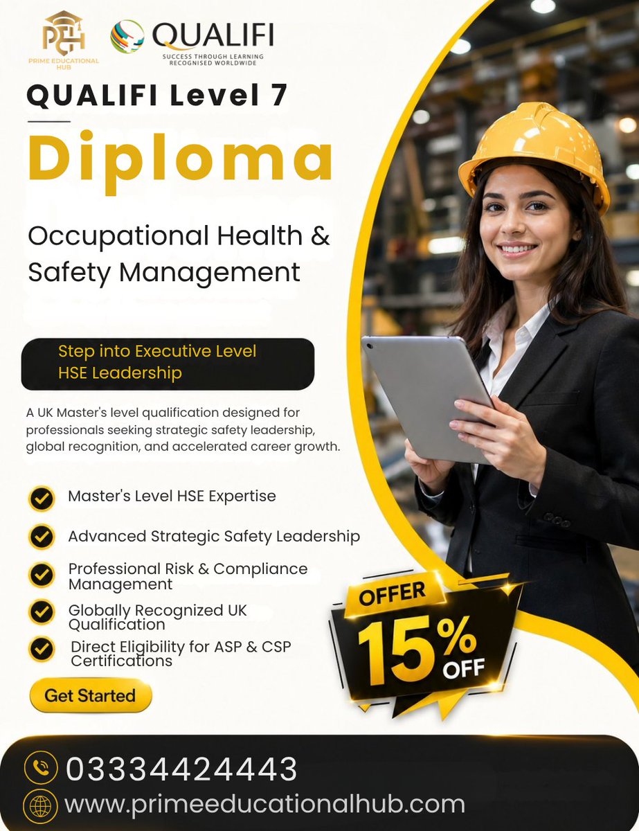 Step Into Executive Level HSE Leadership! Limited Time Offer: Get 15% OFF! Call Now: 0333 4424443 primeeducationalhub.com Enroll today and secure your future in HSE leadership! . . -- #HSE #OccupationalHealthAndSafety #SafetyManagement #QualifiLevel7 #HSEDiploma #SafetyCareer