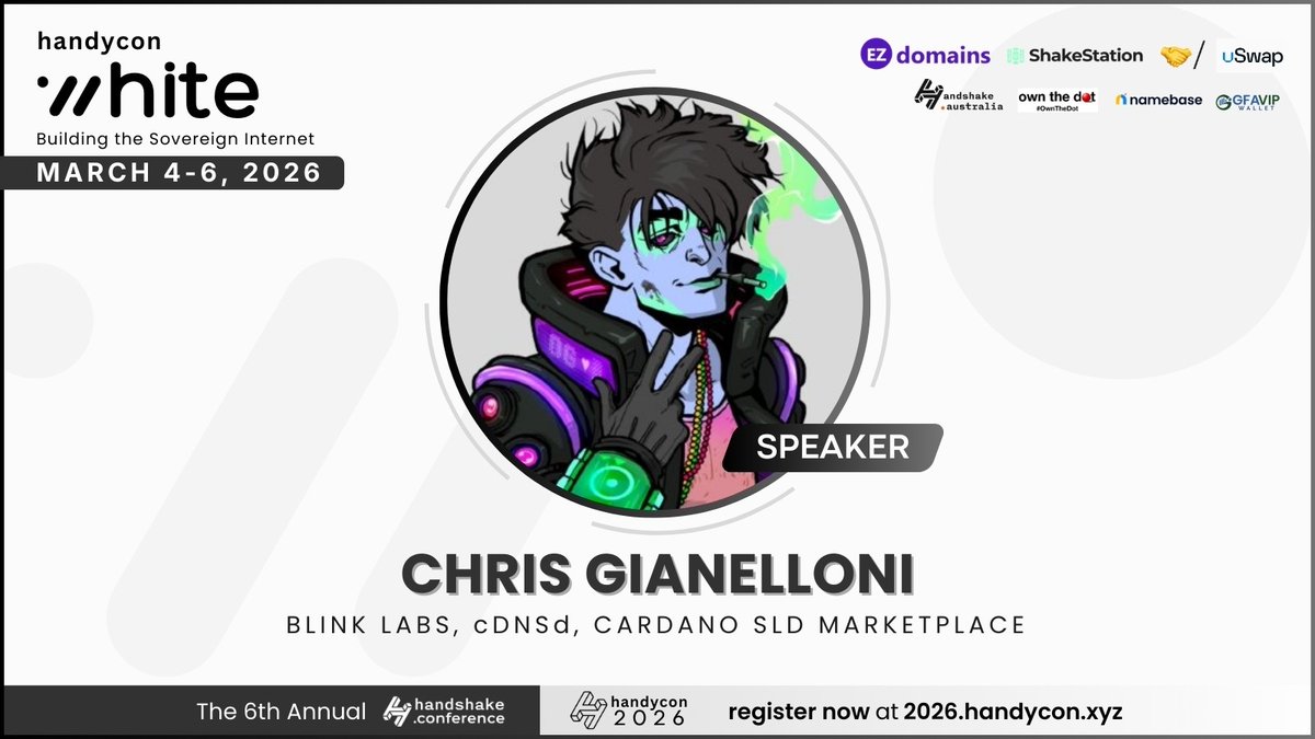 Excited to speak at the 6th Handshake.Conference! @handshakecon 🤝🤍 March 4–6 | Learn more: 2026.handycon.xyz Secure your ticket: tickets.gfavip.com/events/49 #privacy #Handshake $HNS #domains #web3 #blockchain