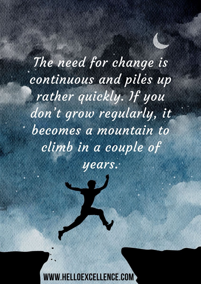 The need for change is continuous and piles up rather quickly. If you don’t grow regularly, it becomes a mountain to climb in a couple of years. #HelloExcellence #MentalHealth #HumanResources #Psychology #Wellness #EmployeeProductivity #SelfLeadership #EmployeeWellness