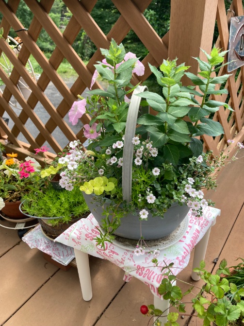バスケットでもりもり育っているのは、 キキョウ とカーペットカスミソウ。 かわゆ♡ #hellojune #gardening #ガーデニング #lowcost #lowmaintainance #TLを花でいっぱいにしよう #Cのお庭 #めちゃかわいい #solovely #デッキバルコニー
