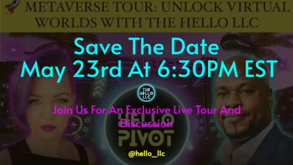 🚀 Exciting news! Join Hello LLC for an immersive journey through the Metaverse on May 23rd at 6:30 PM EST. Explore virtual realms like Sandbox, Decentraland, Fortnite, ROBLOX, and more! Don't miss out on this exclusive event. #HelloPivot #MetaverseTour 🌐💼"