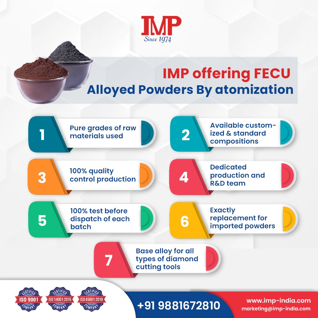 IMP offering FECU Alloyed Powders By atomization 1. Pure grades of raw materials used 2. Available customized & standard compositions For more details call: +91 9881672810 imp-india.com #IMP #IMPIndia #HighPurityPowder #PrealloyedPowder #DiamondCuttingToolIndustry