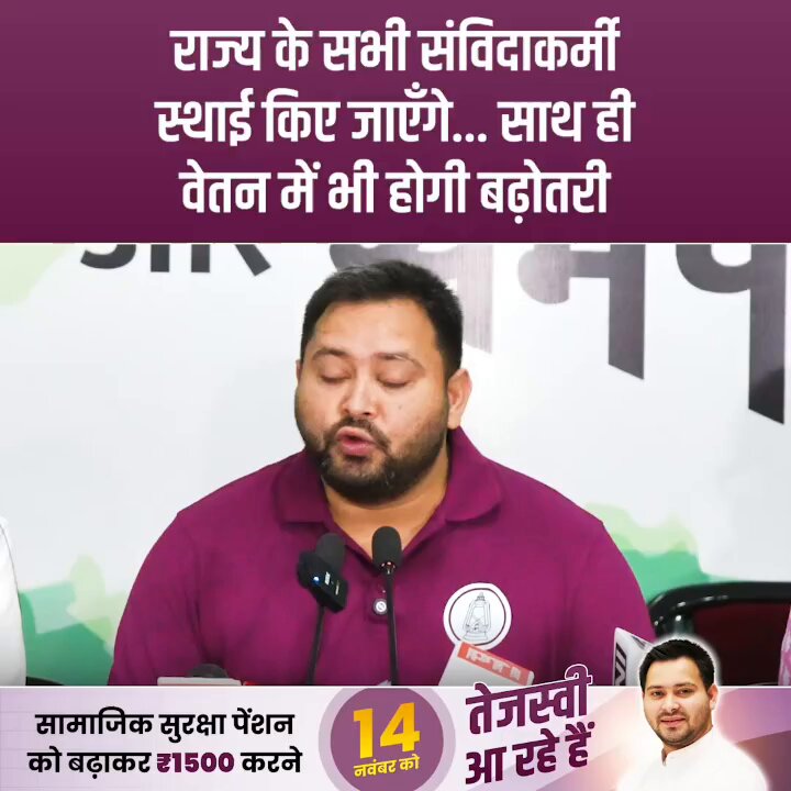 राज्य के सभी संविदाकर्मी स्थायी किए जाएँगे! साथ ही वेतन में भी होगी बढ़ोतरी! खत्म होगा संविदाकर्मियों का शोषण, उनपर दबाव और कभी भी उनकी सेवा समाप्त कर देने वाली मनमानी का निरंकुश दुष्चक्र! बनेगी #तेजस्वी_सरकार तो सभी संविदाकर्मी स्थायी नौकरी पाएंगे! @yadavtejashwi #RJD
