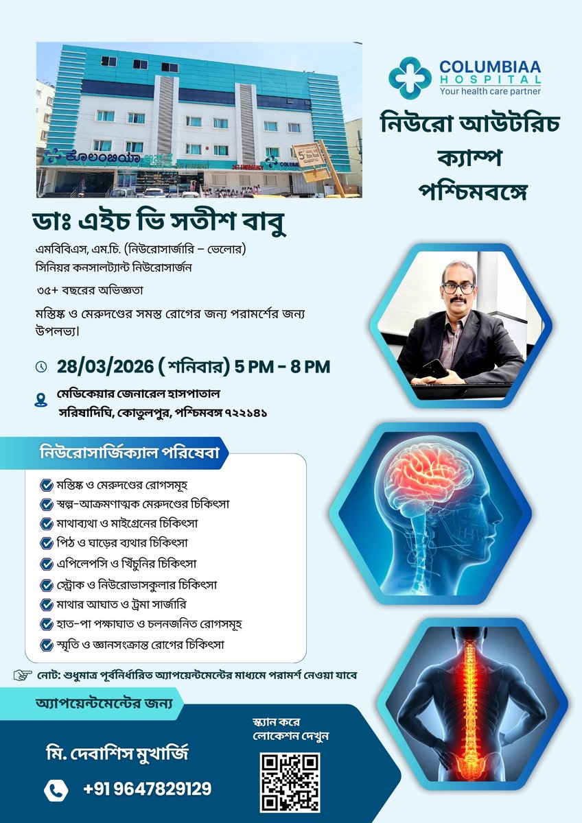 পশ্চিমবঙ্গে নিউরো আউটরিচ ক্যাম্প | ডা. এইচ ভি সতীশ বাবু, Columbiaa Hospital। ২৮ মার্চ, বিকাল ৫টা–রাত ৮টা, Medicare General Hospital, কোতুলপুর। অ্যাপয়েন্টমেন্ট: +91 9647829129 #NeuroCamp #BestDoctor #HospitalNearMe #DoctorNearMe