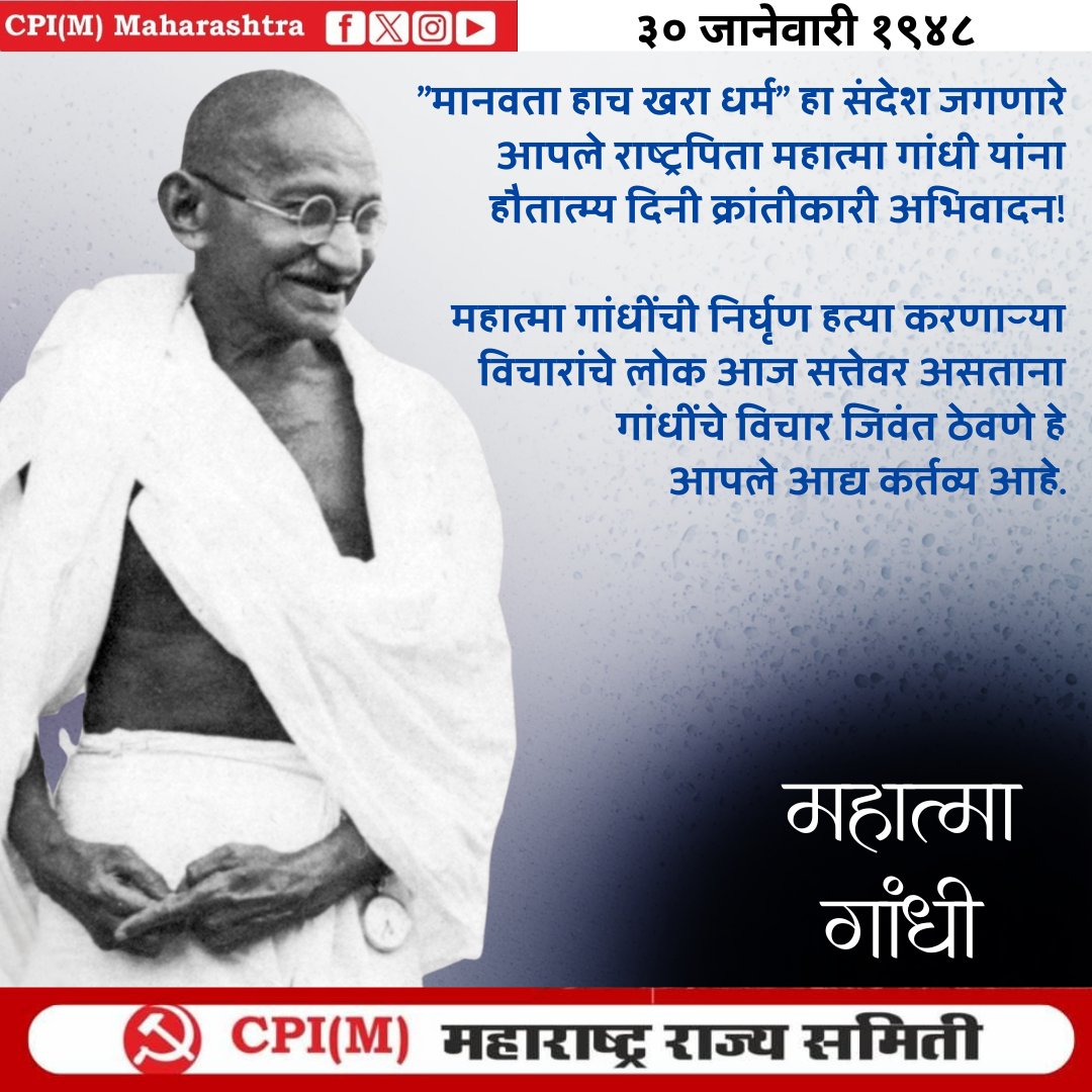 ३० जानेवारी १९४८ "मानवता हाच खरा धर्म" हा संदेश जगणारे आपले राष्ट्रपिता महात्मा गांधी यांना हौतात्म्य दिनी क्रांतीकारी अभिवादन! महात्मा गांधींची हत्या करणाऱ्या विचारांचे लोक सत्तेवर असताना गांधींचे विचार जिवंत ठेवणे हे आपले कर्तव्य आहे. #MahatmaGandhiji #MartyrdomDay #Humanist