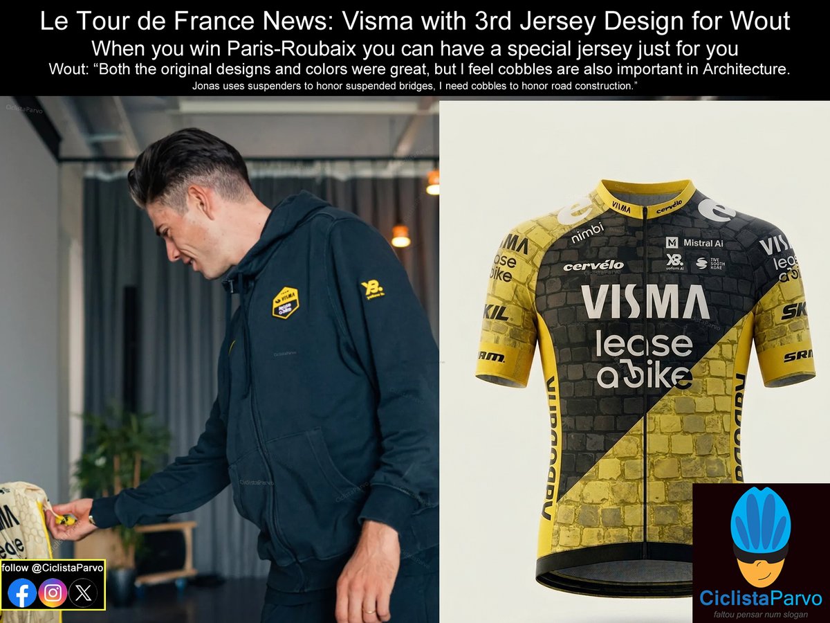 @vismaleaseabike with 3rd @LeTour Jersey Design for @WoutvanAert You win @parisroubaix you can have a special jersey Wout: "cobbles are important in Architecture. Jonas uses suspenders to honor suspended bridges, I need to honor road construction." #humor #fun #ciclistaparvo