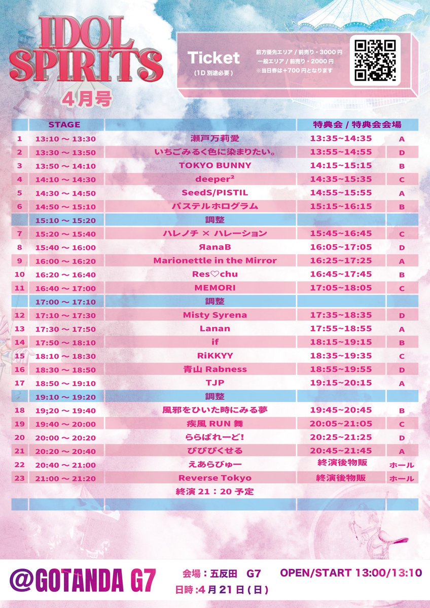 4/21 #IDOLSPIRITS 4月号 @五反田G7 📣いちみる予約:特典券1枚(入口) 🎁トライアルプレゼント企画: 「全員お話会」特典会スタート時 (10秒) ライブ🎤13:30〜13:50 特典券🖍13:55〜15:55 🎟 t.livepocket.jp/e/rihn3 当日昼12時まで前売扱い‼️ 📸撮可VNG 🔰ご新規様ハーレム写メ 🫶ご紹介特典券1枚