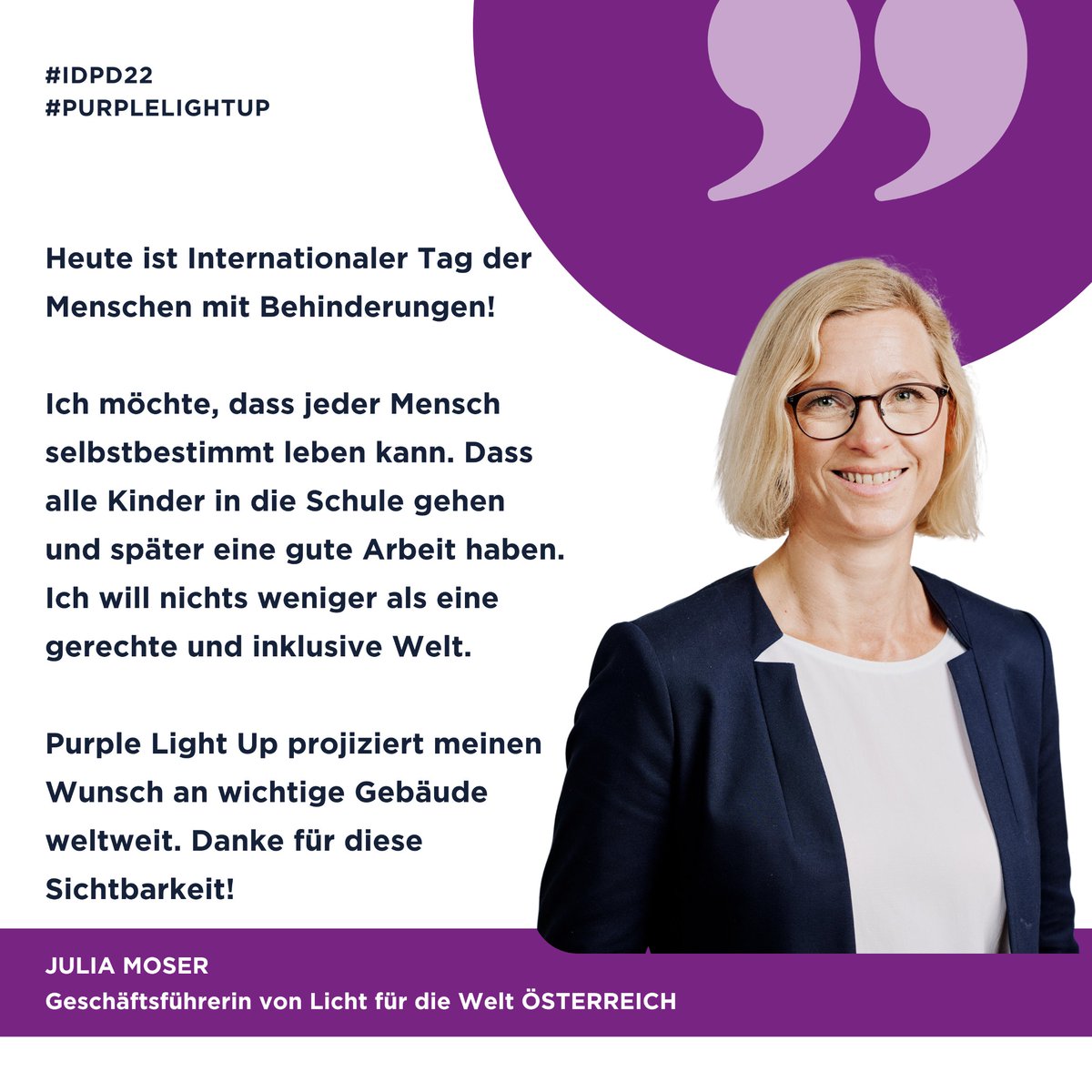 Menschen mit Behinderungen können und wollen arbeiten! 🤝 Am 3.12., dem Tag der Menschen mit Behinderungen, setzen wir ein sichtbares Zeichen für ein selbstbestimmtes Leben – wir strahlen lila! 💜 #PurpleLightUp #myAbility #IDPD22 #InclusionRevoltion @_juliamoser_