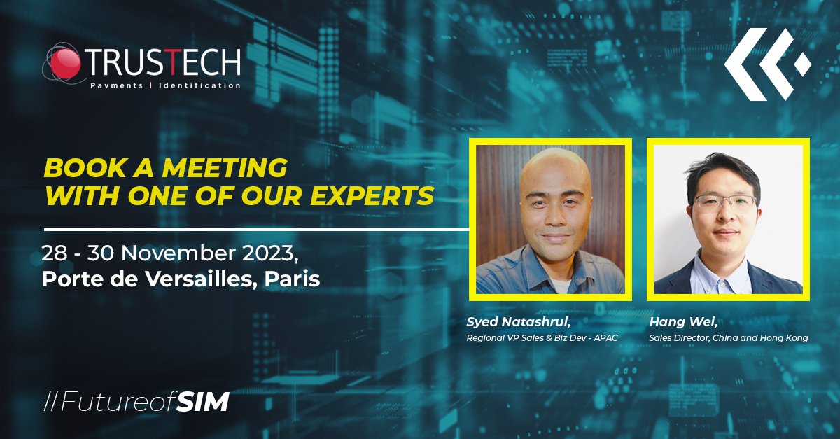 Kigen’s Syed and Hang W will be at @TRUSTECH_Event, ready to discuss how we can bring the #FutureofSIM to innovate payment and identification systems! 💥 Are you going? Book a meeting with us! 👉 kigen.com/contact/ #IDSystems #Trusttech #eSIM #iSIM #IoT