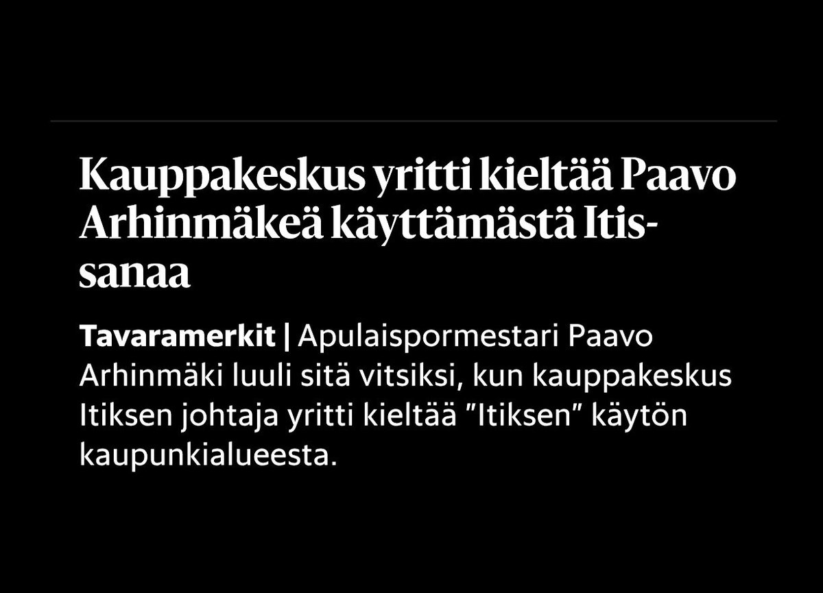 Väärin myönnetty tavaramerkki. Itis on Itä-Helsingin nimitys ollut aina ja varmaan itis muutenkin ollut käytössä muuallakin. #Itis Kauppakeskus yritti kieltää Paavo Arhinmäkeä käyttämästä Itis-sanaa hs.fi/helsinki/art-2…