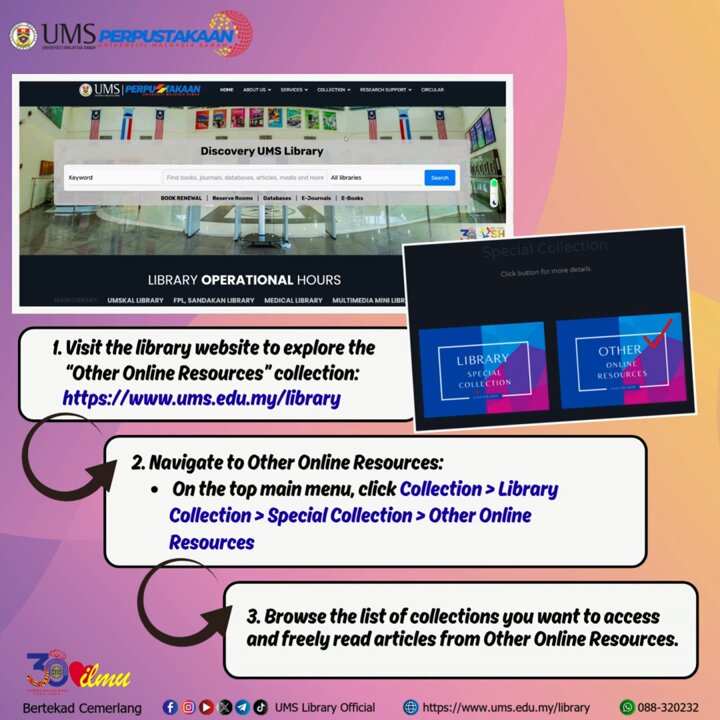📲 Let’s explore Other Online Resources to support your research and learning needs. Follow the simple steps provided! 🌐Get started at: ums.edu.my/library Happy exploring and expanding your knowledge!😀 #ResearchSupport #AcademicResources #IncreasingKnowledge #UMSLibrary
