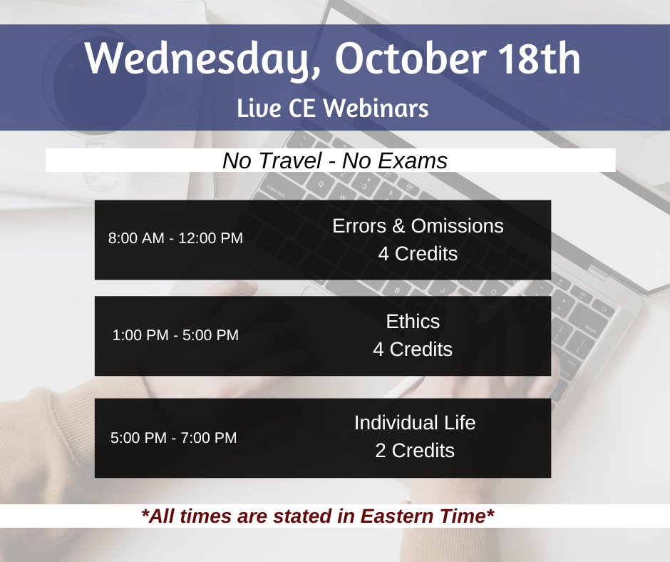 Join us on Wednesday for E&O, #Ethics, and #IndividualLife. Earn #InsuranceCE credits with our live #webinars - #NoTravel & NoExams! Register now: bit.ly/3FjCzMa #EasyCE