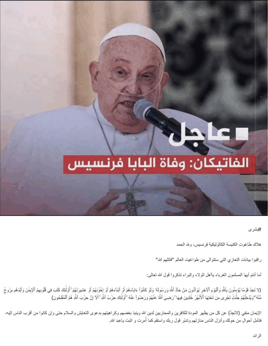 Unofficial #IslamicState (IS) Al-Ra'id Media Fuels Hatred Against #Infidels on the Day the #Pope Dies, Cyberspace trackingterrorism.org/chatter/al-rai…