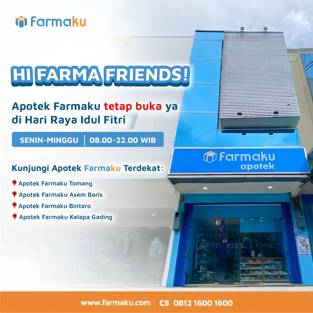 Hi Farma Friends! Jangan khawatir, di Hari Raya Idul Fitri apotek Farmaku tetap buka seperti biasa🤗 Kunjungi Apotek Farmaku terdekat: 📍Apotek Farmaku Tomang 📍Apotek Farmaku Asem Baris 📍Apotek Farmaku Bintaro 📍Apotek Farmaku Kelapa Gading #Farmaku #InfoLebaran #Lebaran2023