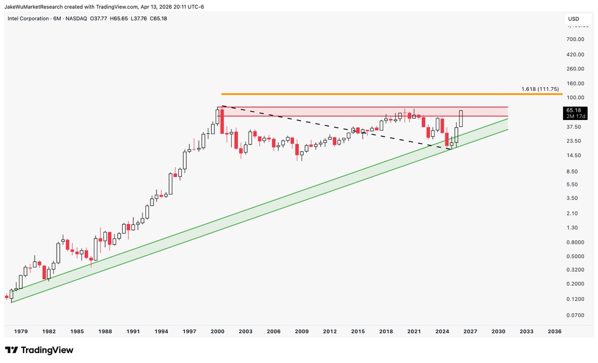 $INTC #INTC Anyone ever seen a 50+ year ascending triangle setup? Now you have! Upside target is the 1.618 extension of the July '00 to January '25 measured move at $111.75.