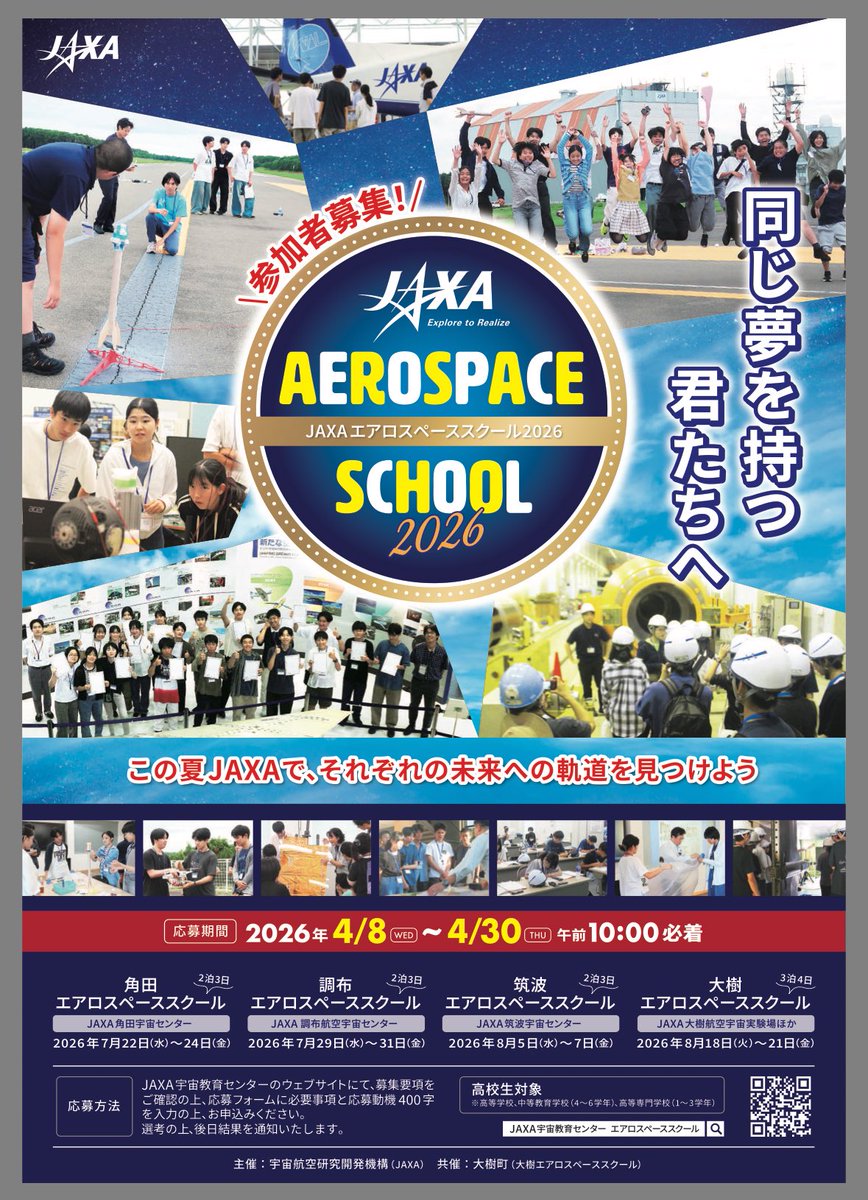 【業務連絡】 ドクスト好きの高校生の皆さんへ コラボ期間中には、「JAXA エアロスペーススクール」という高校生が協力して挑む、宇宙・航空ミッションの宿泊型プログラムが筑波宇宙センターであるわよ。 JAXAの事業所を訪問し、職員や最先端の研究設備に直接触れられますの。 #DrSTONE #JAXA
