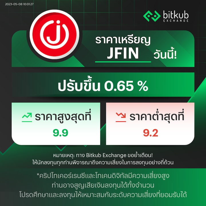 The Price of JFIN at Bitkub Exchange rose 0.65 % recording a daily high at 9.90 baht and a daily low at 9.20 baht . Learn more about digital asset investment here: bitkub.com/blog/crypto-in… . #bitkub #JFIN #priceupdate #marketupdate