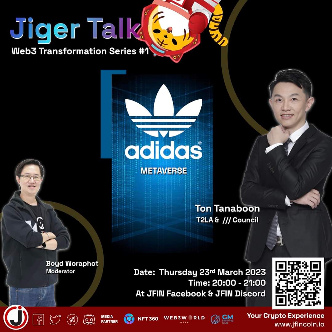 มาฟังพี่ต้น พี่บอย ใน 🐯Jiger Talk : Adidas int to Metaverse ก้าวสำคัญที่ Adidas กำลังกลับมาจริงจังกับโปรเจคนี้อีกครั้งหนึ่ง พฤหัสนี้ 23/3 8PM 👇🏻 discord.gg/fu3XvyY4 #Jiger #JFIN #JFINChain #Adidas #Metaverse #Web3Transformation