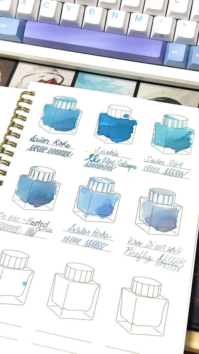 Today’s fp ink swatches. I can’t get enough of the blues 🩵🩵🩵 My favorite is Van Dieman’s Firefly!!! 💕 #sailor #jherbin #vandieman #oninks