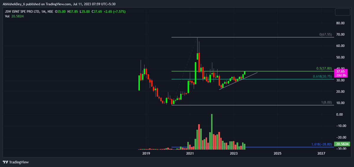 Good Opportunity in #JSWISPL for short to mid term gain CMP: 31.95 Target : 48 (51%) and 63 (98 % ) #JSWISPL #Trading #Investing #Shortterm #Midterm #StockMarket #Nifty