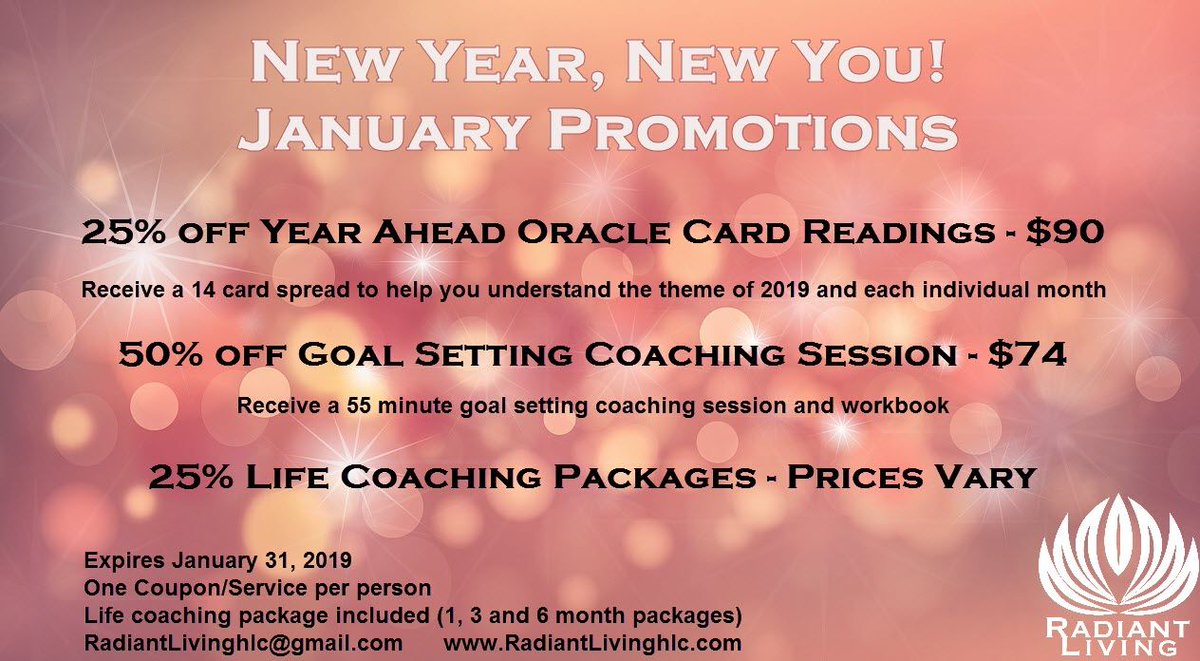 New Year, New You! Kick your year off right with one of these great deals! Readings, coaching sessions and packages are on sale! #januarypromotion #Success #lifecoach