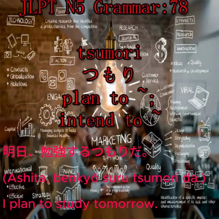 JLPT N5 Grammar:78 tsumori つもり plan to ~; intend to ~ #jlptn5 明日、勉強するつもりだ。 (Ashita, benkyō suru tsumori da.) I plan to study tomorrow. 日本に行くつもりだ。 (Nihon ni iku tsumori da.) I intend to go to Japan. #minnanonihongolistening #japaneselanguagelearning