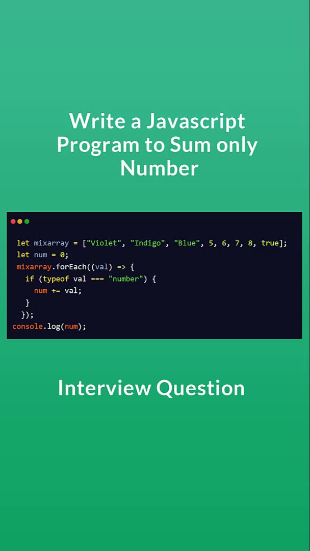 Write a Javascript Program to Sum only Number In an Array | JavaScript Interview Questions youtu.be/zpESP3AYga4 Tags: #javascript #javascriptinhindi #javascriptinterview #coding #programming #webdevelopment #web #html5 #css3 #dcodeshow