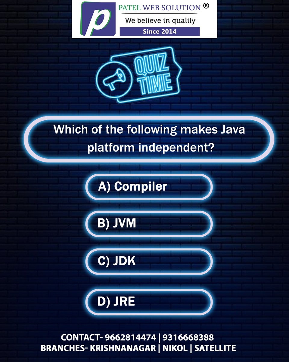 💡 **Quiz Time!** Which component makes Java platform-independent? 🤔 Drop your answer in the comments 👇 Learn Java the smar t way with **Patel Web Solution** 🚀 📞 **Contact:** 9662814474 | 9316668388 📍 **Branches:** Krishnanagar | Nikol | Satellite #QuizTime #JavaQuiz