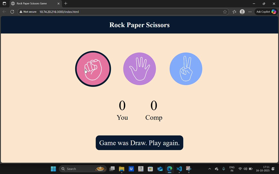 Day 76 of #100DaysOfCode (16 October) Completed my Stone Paper Scissors Game 🎮 using HTML, CSS & JS Added real-time score tracking for both user & computer Dynamic result messages (Win/Loss/Draw) Interactive gameplay logic with event listeners #WebDev #JavaScript #CONNECT