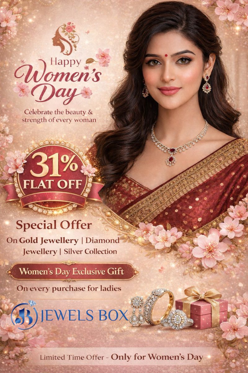 ✨ Happy Women’s Day! ✨ Celebrate the beauty, strength, and grace of every woman this Women's Day. 🎉 Women’s Day Special Offer 💎 Flat 31% OFF on Gold Jewellery Making Charges 💎 Flat 31% OFF on Diamond Jewellery Value #HappyWomensDay #JewelsBox #JewelleryOffer #GoldJewellery