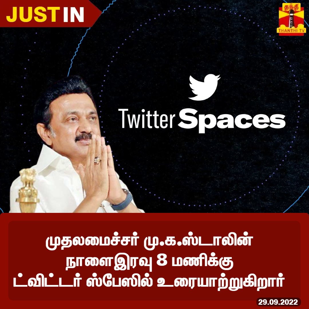 BREAKING | First time in Twitter history, Tamil Nadu CM Thiru @mkstalin will be addressing the #DravidianMonth #TwitterSpaces event organised by @DMKITwing tomorrow at 8PM. #Join #TamilSpaces #DravidianModel