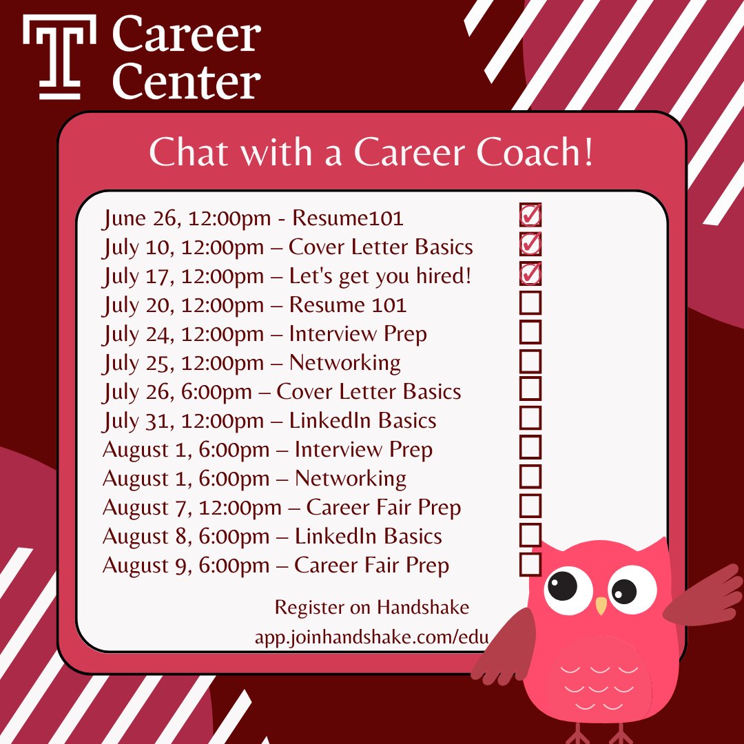 Thank you to everyone who joined the first three sessions of "Chat with a Career Coach." Be sure to register at app.joinhandshake.com/edu to register for our upcoming sessions in July and August! #handshake #templeuniversity #joinhandshake #templecareercenter #ownyourfuture
