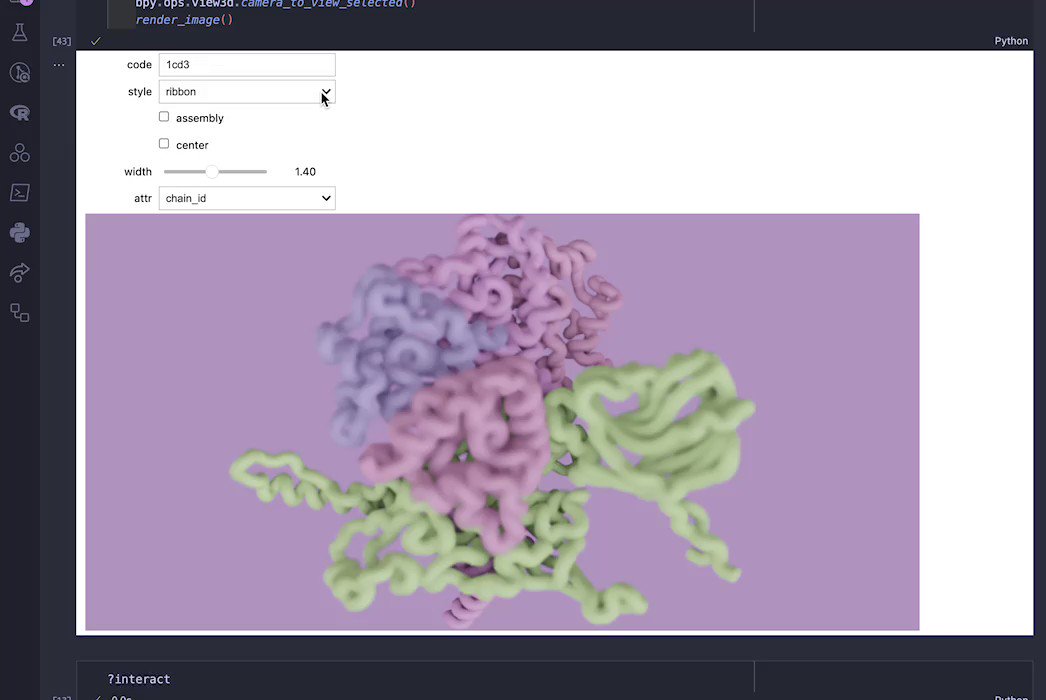 Combining #b3d and #Eevee with #JupyterNotebooks and #MolecularNodes, you can interactively style and render proteins from inside a live notebook. Actually works a lot better than I thought it might. #GeometryNodes inside of python notebooks is a cool combo