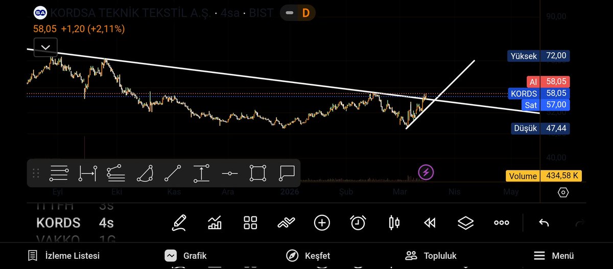 #KORDS Güncel Grafik 📈 Haftalık grafikte tekrardan bir düşen trend kırılımı aktif. Takibe değer ✅