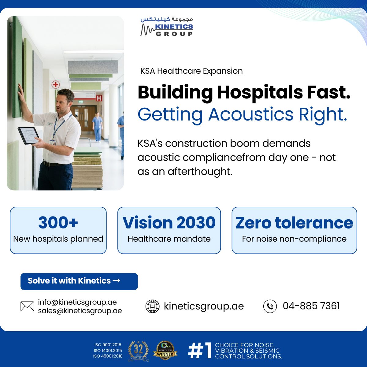 KSA is building 300+ hospitals. 🏥 Acoustic compliance can't be an afterthought. Kinetics Group - 32 years of getting it right. 📧 [email protected] 📞 +971 4 885 7361 🌐 kineticsgroup.ae #KSA #Vision2030 #AcousticCompliance #KineticsGroup