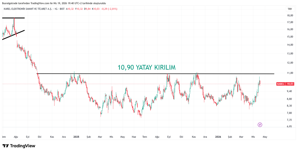 #KAREL Durum çok net; 10,90 üzeri YATAY KIRILIM gelir. Epeydir altında fiyatladığı için kırılımla beraber hızlıca yükseleceğini düşünüyorum.