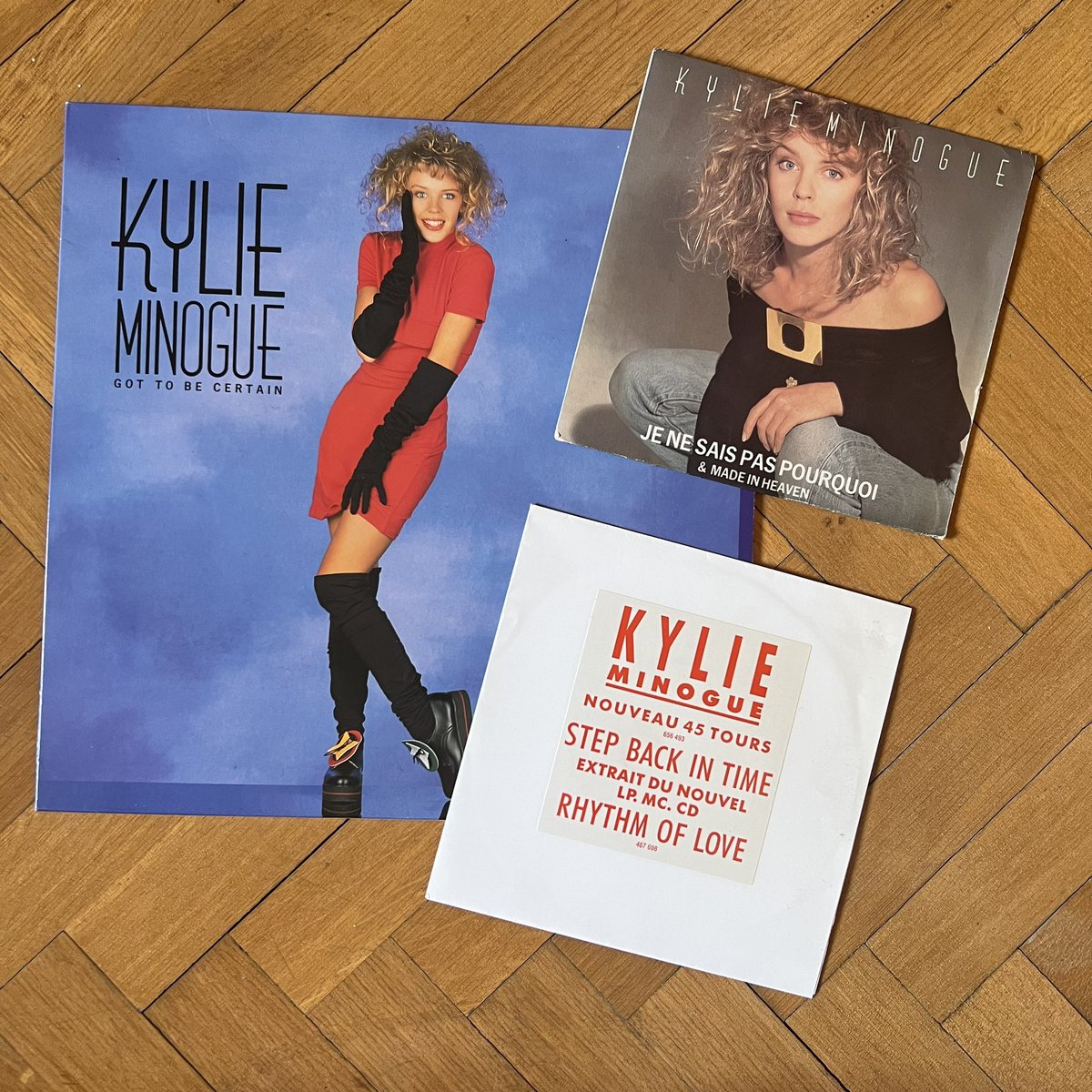 My Kylie finds in Spain: “Got to Be Certain” Spanish 12” with black lettering, “Je Ne Sais Pas” one-sided Spanish promo 7” and French “Step Back in Time” 7” on stickered plain white sleeve and grey labels. 😍 @PWLHitFactory #PWL #StockAitkenWaterman #KylieCollection