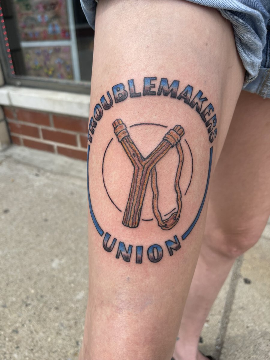 After 12 years on staff and after the largest @labornotes conference, it was time to celebrate and make the Troublemakers Union slingshot a reality. #labornotes #tattoo #BluzTattoz #troublemakersunion