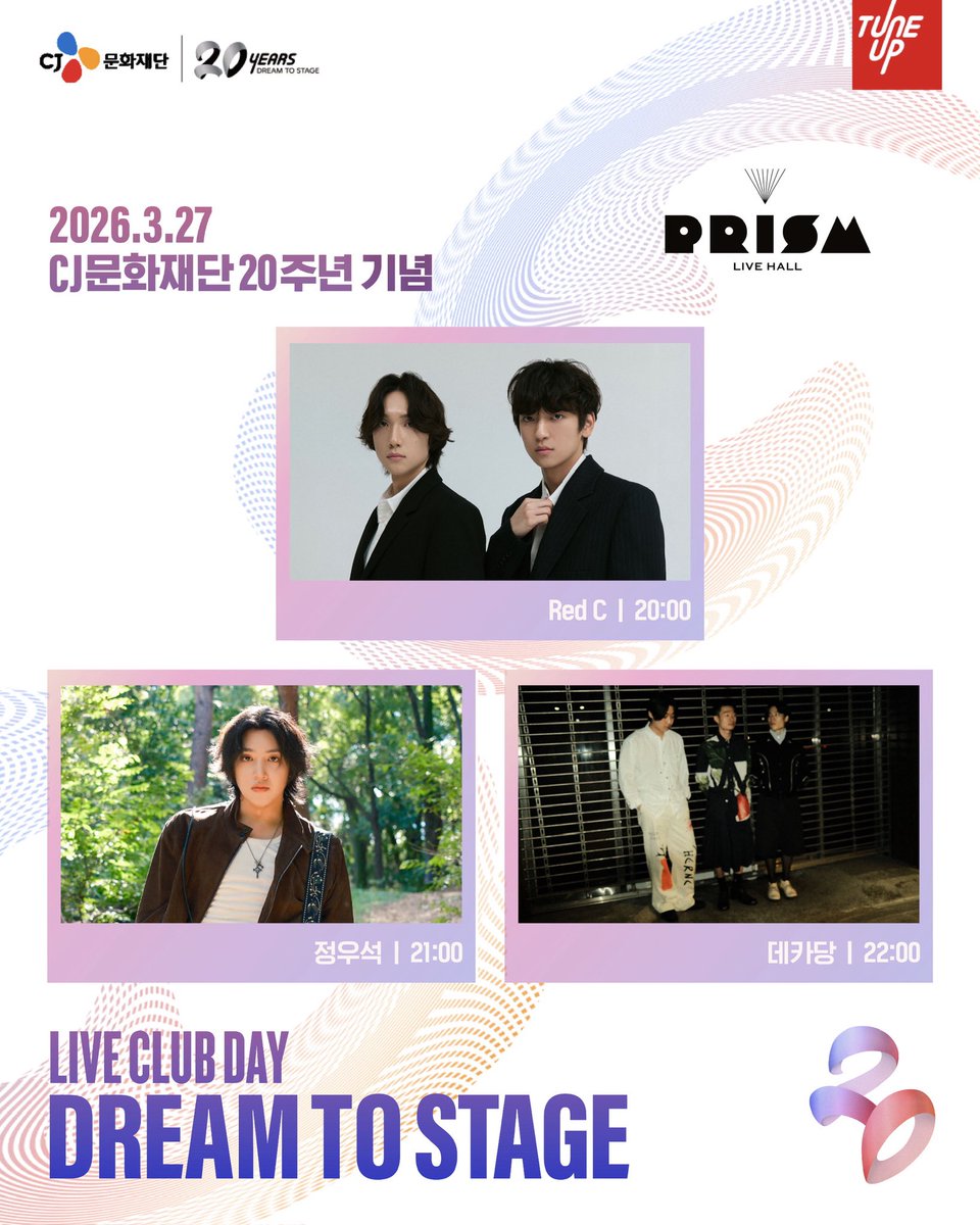 CJ문화재단 20주년과 함께하는 제79회 라이브클럽데이 🎉 📌프리즘홀 20:00 Red C / 튠업 22기 21:00 정우석 / 26기 22:00 데카당 / 튠업 18기 - 예매처: 멜론티켓🍈(@liveclubday 프로필 링크) 공연 날짜 📆 2026년 3월 27일 공연 시간 ⏰ 8 PM #liveclubday #LCD #라클데 #cj문화재단 #cj튠업