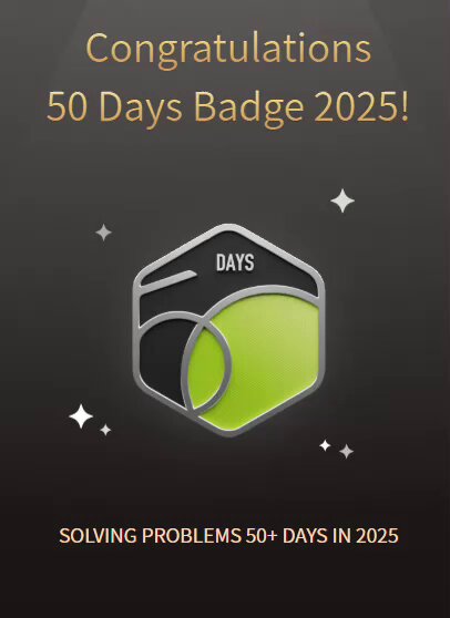 Awesome feeling! Just crossed 50 problems on LeetCode. ✅ I'm learning so much more just by solving, and I can feel my thinking and problem-solving approach improving. Excited to keep this grind going and take it to the next level! 🔥 #LeetCode #DSA #CPP #ProblemSolving