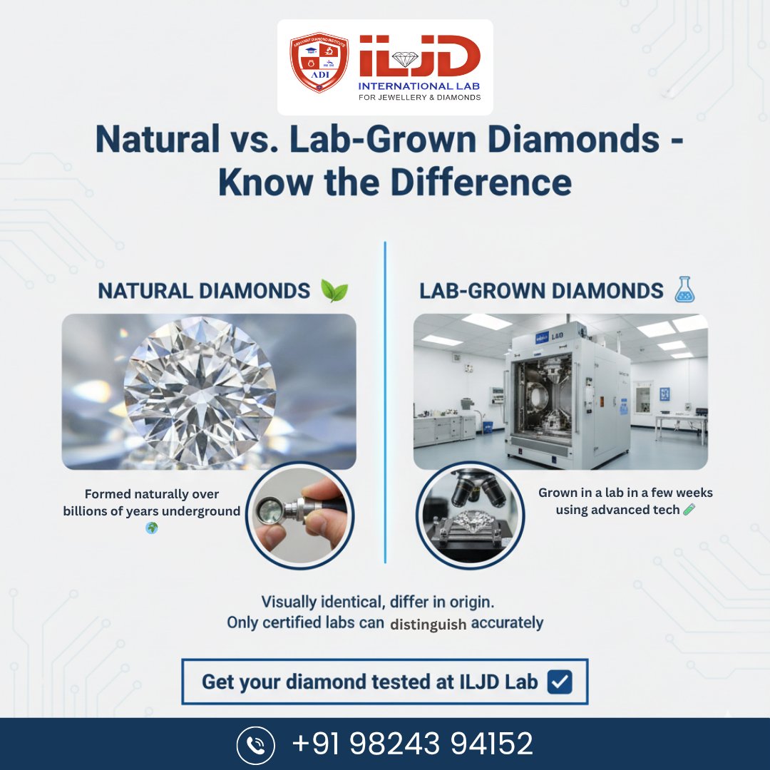 💎 Natural or Lab-Grown? Know the Difference with ILJD Lab! At ILJD Lab, we offer trusted certification services that clearly identify whether your diamond is natural or lab-grown. For More Detail call us on 9824394152 #ILJDLab #DiamondCertification #LabGrownVsNatural