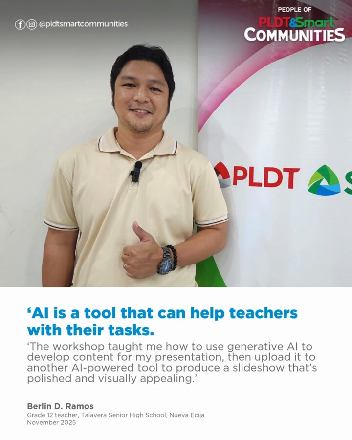 PLDT & Smart's AI for All bootcamp offers teachers a hands-on experience with AI-powered applications that can create dynamic lessons, provide instant feedback, analyze data, and automate routine tasks. Read more: bit.ly/4iqZDeT #LearnSmart #PeopleofPLDTSmartCommunities