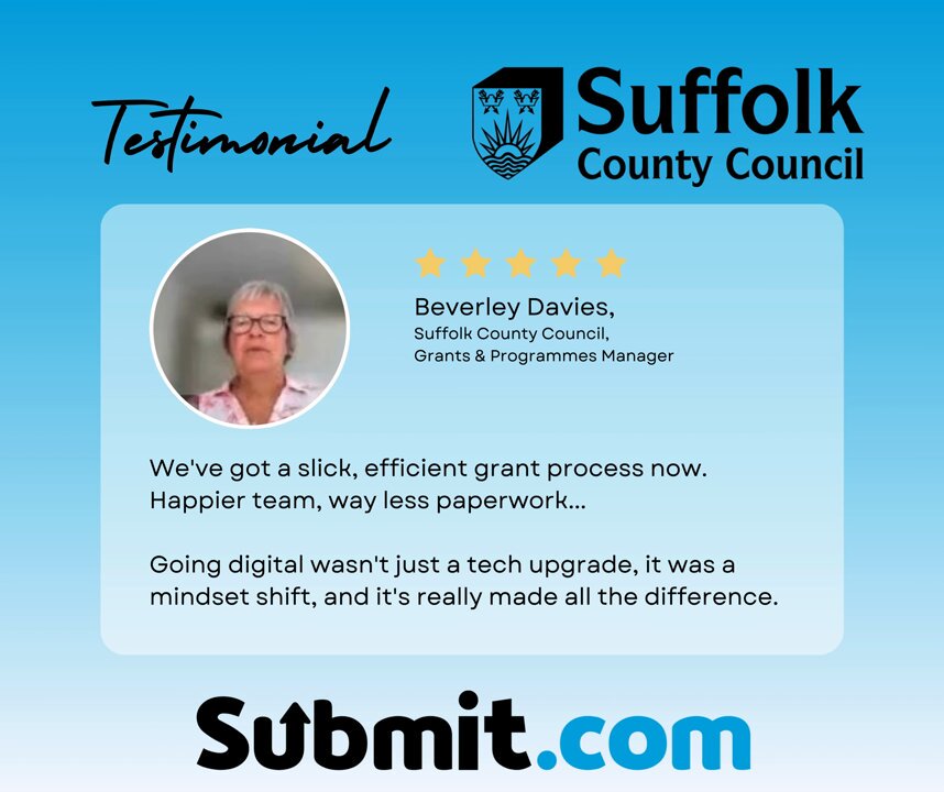 Watch Beverley Davies, Grants & Programmes Manager at Suffolk County Council, share how Submit.com cut paperwork, boosted morale, and transformed their grant process. #DigitalTransformation #GrantManagement #LessAdminMoreImpact
