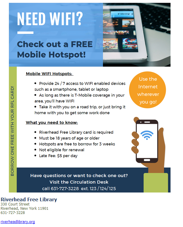 There's something new you can do with your #RFL card- we now have mobile Wi-Fi hotspots available at the Riverhead Free Library that you can borrow for up to three weeks! More information and policies here: libraryaware.com/2K2YDP #librariesforeveryone #librarythings #hotspot
