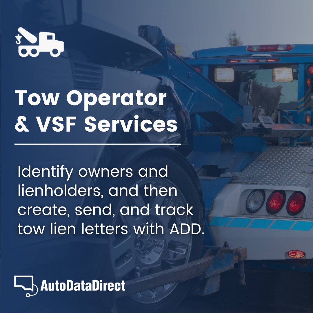 Streamline your operations with our Tow Operator & VSF Services! 🚗 From NMVTIS Title Check to DirectPost-Office, we have everything you need to simplify compliance and manage your workflow efficiently: hubs.la/Q030glXy0 #AutoDataDirect #LienManagement #Towing