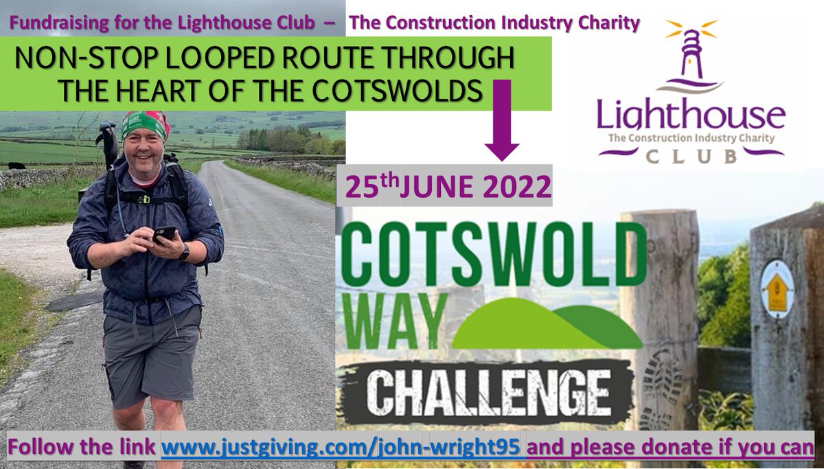 Fundraising for the #LighthouseClub Taking on the Cotswold Way Challenge - 100km NON-STOP Date: 25 June 2022. John is challenging himself to 100km non-stop for #MentalHealth in #Construction. Follow the link justgiving.com/john-wright95 and please #Donate if you can.