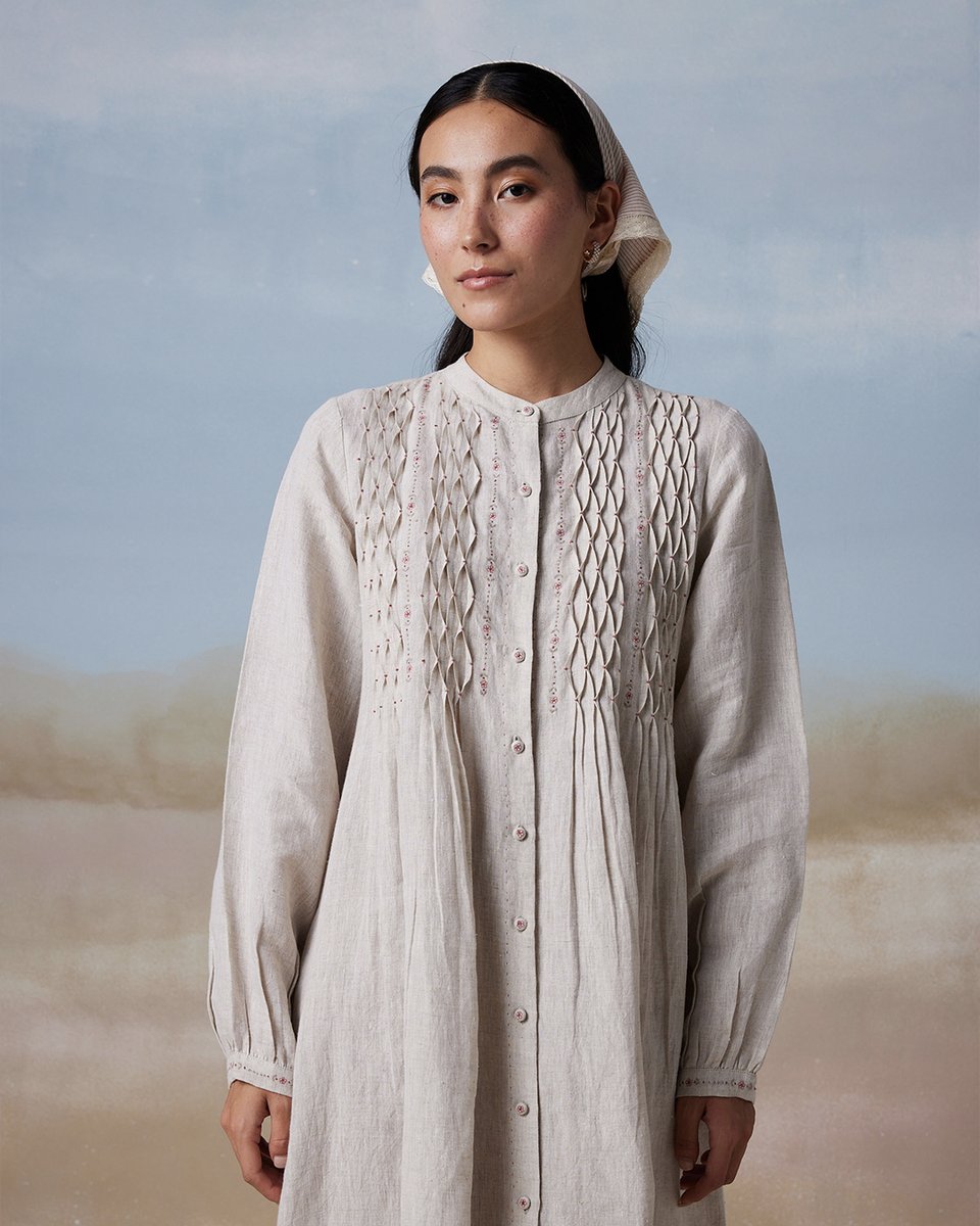 Embracing the joys of nature, Maggie’s Farm Dress in handwoven linen with delicate embroidery and hand smocking, reminiscent of the good ole’ slow days living in the countryside 🌾 bunastudio.com/products/maggi… #Buna #BunaStudio #lightnessofbeing #smocking #linendress #handwoven