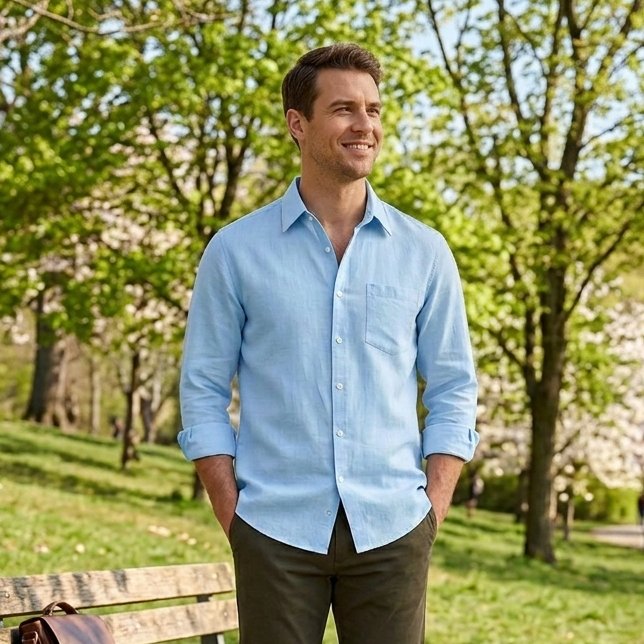 Linen season is officially here. 🧊 The light blue long-sleeve: for when you want to look sharp without feeling the heat. #SpringFashion #LinenLife #MensStyle