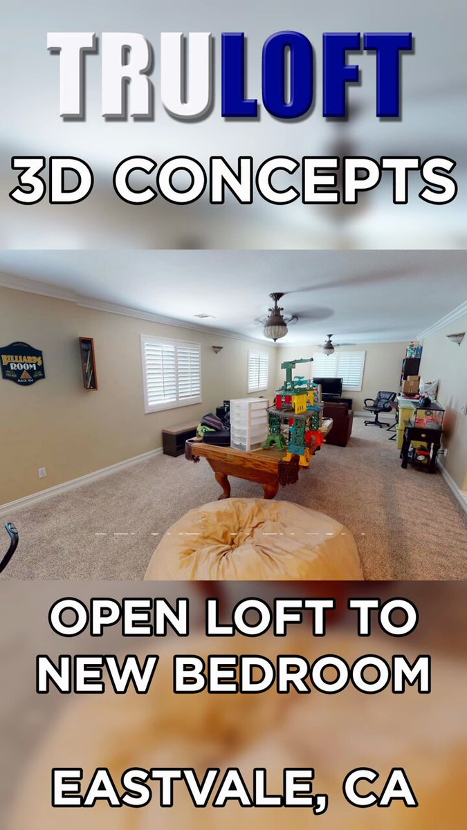 Turning that big empty space into a spacious open loft! 🏡⬆️ With 3D Designs, you can see the impact of this addition before construction begins! #HighCeilingConversion #LoftAddition #HomeRenovation #BeforeAndAfter #CaliforniaHomes #3ddesign