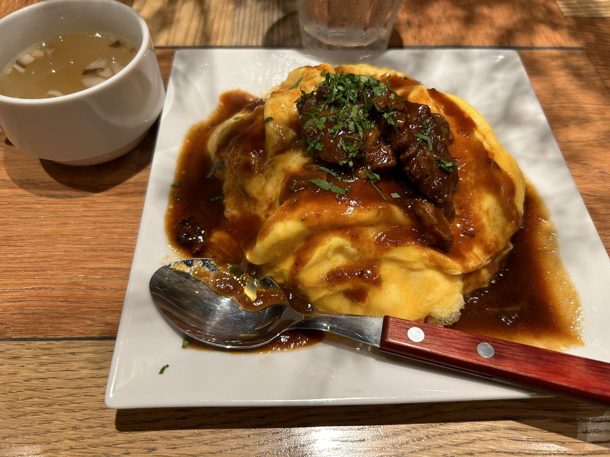 前回キーマカレー大頼んだのに並がきたから今日はオムライス。肉がでかい。オムライスの優待ってあんまないからいいですね。今からフットサルの大会。走ったら半分ぐらい出しそうな量でした。岸田のせいでガラガラ。頑張って欲しい #log50 #オムライス #テンアライド #優待 #キッチンの彼がイケメン